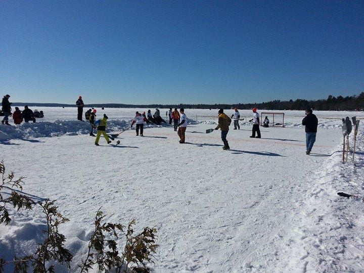 On the ice, is the annual Broomball Competition, the snowmobile radar run, and the ice fishing derby!
